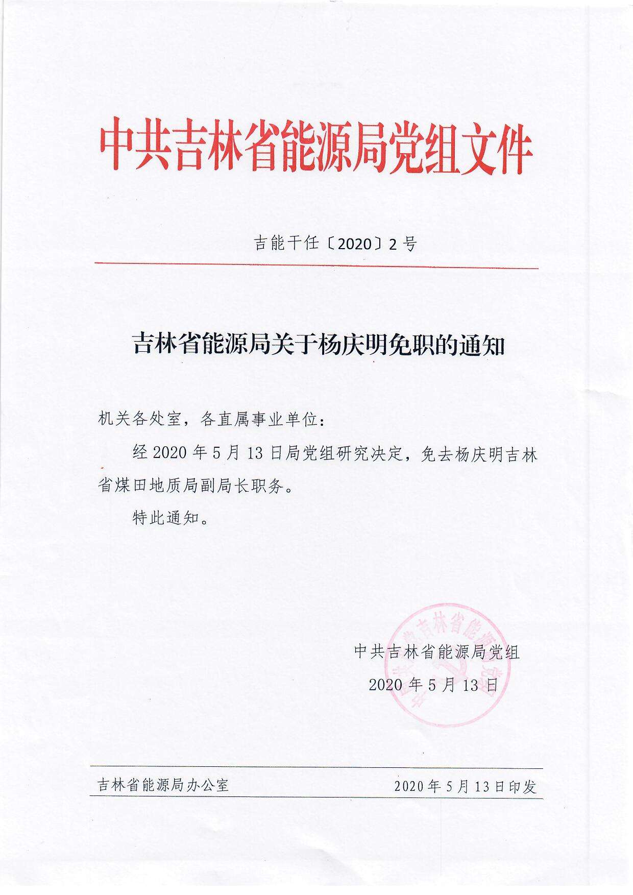 吉林省能源局关于杨庆明免职的通知